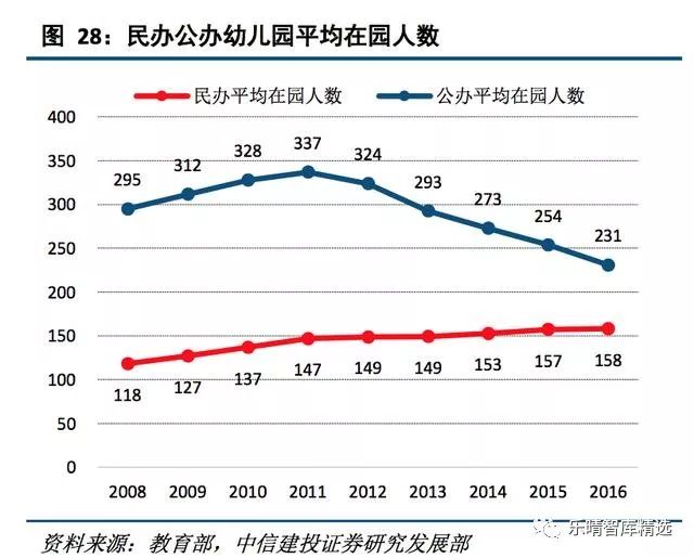 2011-2016年,公办幼儿园平均在园人数一直在下降,但仍旧达到231人/园,虽然公办幼儿园在师资力量上不存在问题,但单园面积有限,人员超标问题普遍存在。