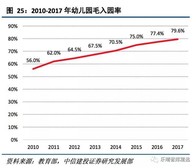 随着我国加大对学前教育的投入,2010年后我国学前教育毛入园率不断上升,到2017年末,我国学前教育入园率达到79.6%,较上年提高2.2个百分点。