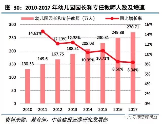2017年估算全国幼儿园和专任教师总数为270.71万人,同比增速为8.34%。尽管增长明显,但实际上,我国学前教育师资数量缺口依旧较大。