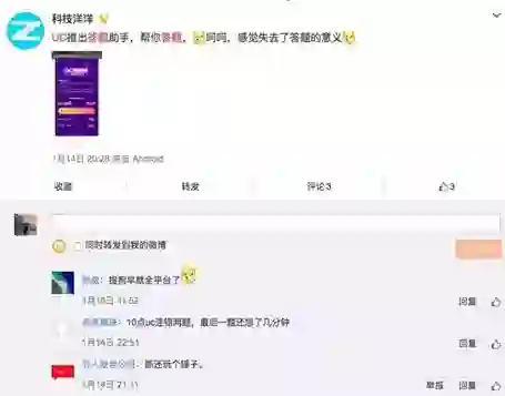 搜索“直播答题”,截至1月17日24:00,微博出现333,564条相关结果,其话题讨论量上亿;百度出现相关结果约7,210,000个,而百度指数上关于直播答题APP的搜索呈现明显上升趋势。
