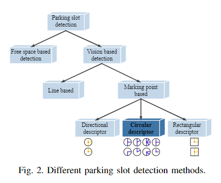 基于标记点的深度方法在停车位检测中占据了主导地位。已经提出了包括DeepPS 和DMPR-PS 等典型工作来识别用于停车位检测的标记点。这两种方法的主要区别在于标记点的描述方式。DeepPs 利用矩形描述符提取停车位顶点的矩形邻域内的图案。然而,矩形描述符对方向变化敏感。因此,具有T / L模板的方向性的描述符来描述顶点的方法已在DMPR-PS中应用。尽管此描述符对方向变化更鲁棒,但它只能提取T / L形等垂直的停车位,不适用于描述复杂的非T / L形场景,例如倾斜和梯形停车位。