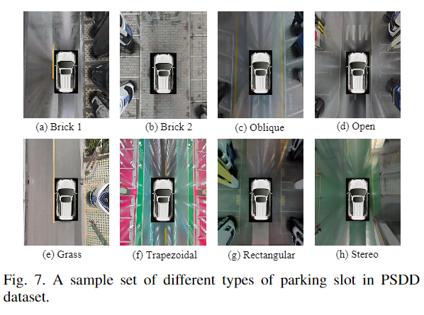 PSDD数据集由从典型的室内和室外停车位收集的14628个校准的环视图像组成。对21种视频序列中的图像进行采样,这些视频序列在7种不同场景中捕获。每个场景有3个序列,进行帧拆分后,对PSDD中的样本进行过滤,从而得到14628个样本。数据集中每个类别数据的数量是不同的,这是由于现实应用中不同停车位的广泛普及,例如矩形停车位和开放式停车位最为常见。露天停车位类别共有3342个样本,矩形停车位类别共有5667个样本,草木停车位类别共有1242个样本,立体停车位类别共有63个样本,梯形停车位类别共有1946个样本,斜停车位类别共有500个样本,砖停车位类别共有1868个样本。一组样本如图7所示,所有实验中训练集与测试集的比例为1:1。