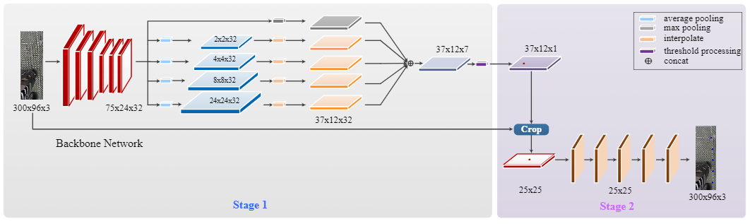 图1.本文提出的PSDet的体系结构。该模型是一个级联结构,第一级主要由backbone,几次下采样操作和插值过程组成。将这些插值后的特征图连接起来以获得包含标记点初始位置的特征图。在第二阶段中,将在第一阶段中获得的标记点的粗略位置作为中心来裁剪子图像,这些子图像被用作卷积神经网络的输入。最后,检测子图像中标记点的准确位置。