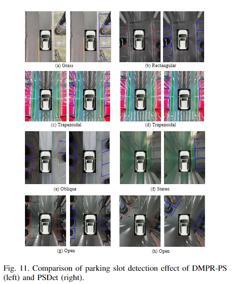 此外,为了验证实际应用中的性能,本文收集并标注了大规模benchmark停车位检测数据集(PSDD),该数据集由7种停车场景组成,包括砖、草、斜面、梯形、开放、矩形和立体停车位。实验证明了本文的方法在PSDD和ps2.0数据集上的有效性和效率。结果表明,PSDet在实现竞争性能的同时,其计算复杂度要比其他方法小得多。