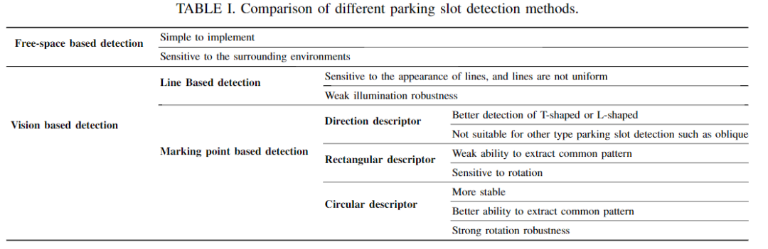 表I列出了不同的停车位检测方法的比较。