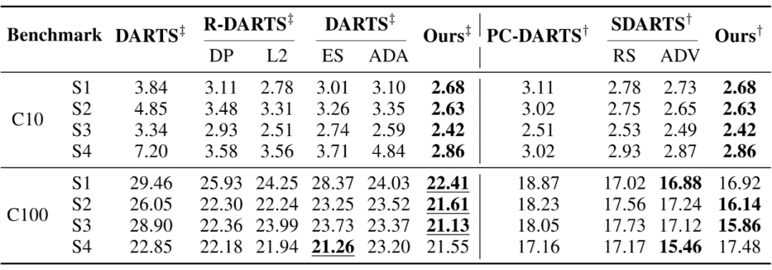 3. 本方法可以与其他 DARTS 的变体方法相结合。去掉人为先验后,在 CIFAR-10 数据集上本方法可分别将 P-DARTS [3] 和 PC-DARTS [4] 准确率再提升 0.8% 和 0.25%。
