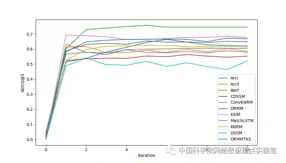 我们对比了多个模型,不同模型的性能如下所示,图 1 为不同模型在 WikiQA 训练数据集上的损失曲线,图 2 为不同模型在 WikiQA 测试数据集上的 NDCG@5 性能曲线,可以看到, MatchZoo-Py 可以复现 Keras 版本的性能,并且发现 Bert 取得了最好的性能。