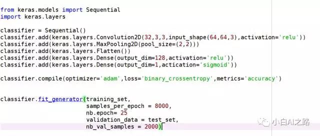 刚才跟大家说了那么多猫狗分类器模型,现在就给大家看下这个分类器模型代码在Keras框架可以少到什么程度!!!