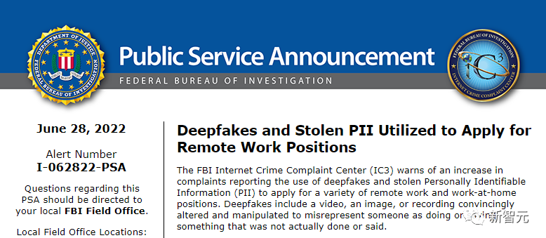 公告指出,FBI 互联网犯罪投诉中心 (IC3)最近收到的用Deepfake和「被盗个人身份信息」 (PII) 申请各种远程工作和在家工作职位的投诉有所增加。