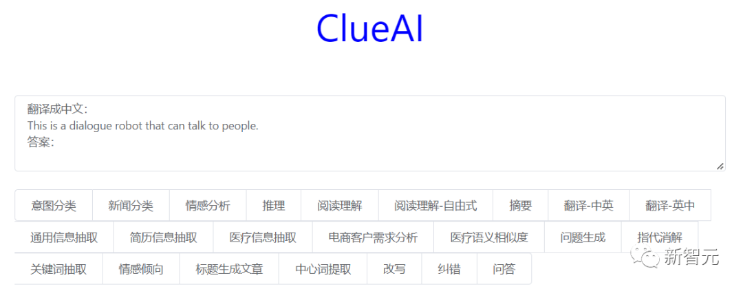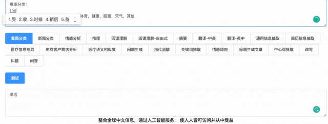 意图分类, 新闻分类, 情感分析, 自然语言推理, 阅读理解, 阅读理解-自由式, 摘要, 翻译-中英, 翻译-英中, 通用信息抽取, 简历信息抽取, 医疗信息抽取电商客户需求分析, 医疗语义相似度, 问题生成, 指代消解, 关键词抽取, 情感倾向, 根据标题文章生成, 知识图谱问答, 相似句子生成/改写, 纠错, 中心词提取.....