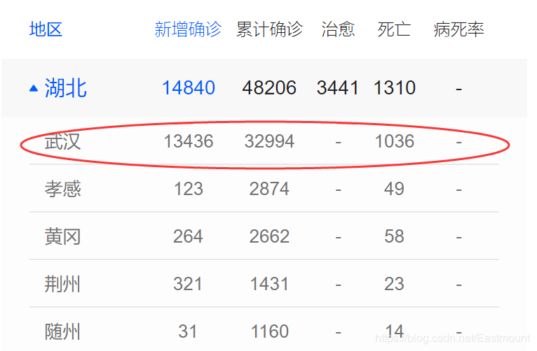 我们将所抓取的数据和真实的数据进行对比,武汉截止2月13日下午4点,新增确诊人数13436、累计确诊32994,发现是完全一致的。