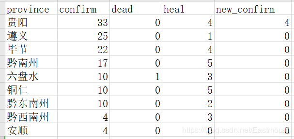 输出结果如下图所示,其顺序按照确诊人数排序。