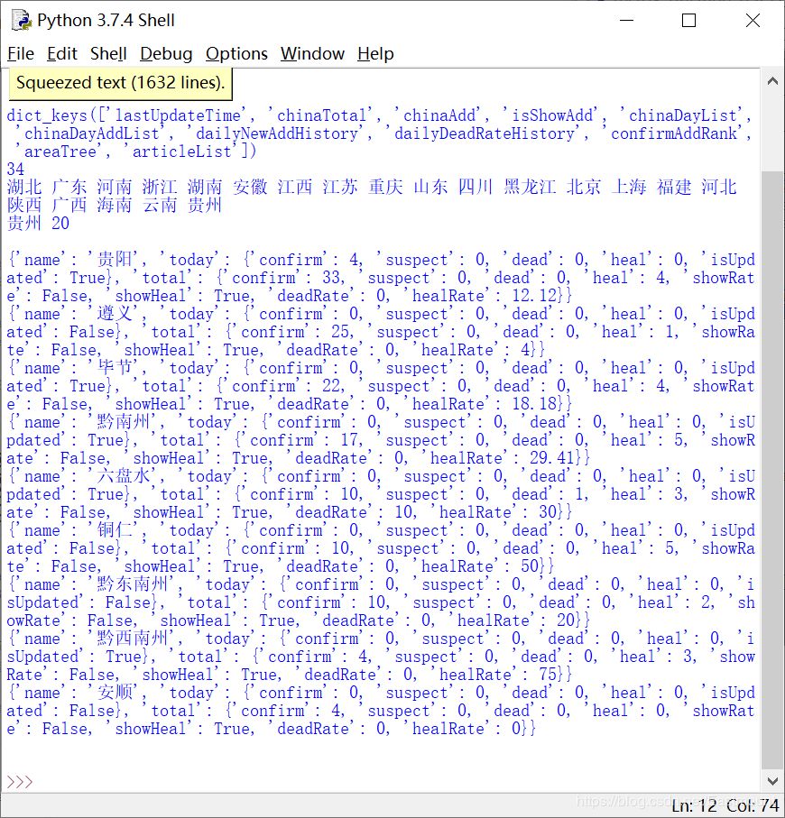 接着通过 num[0][‘children’] 获取湖北省的疫情数据,代码如下: