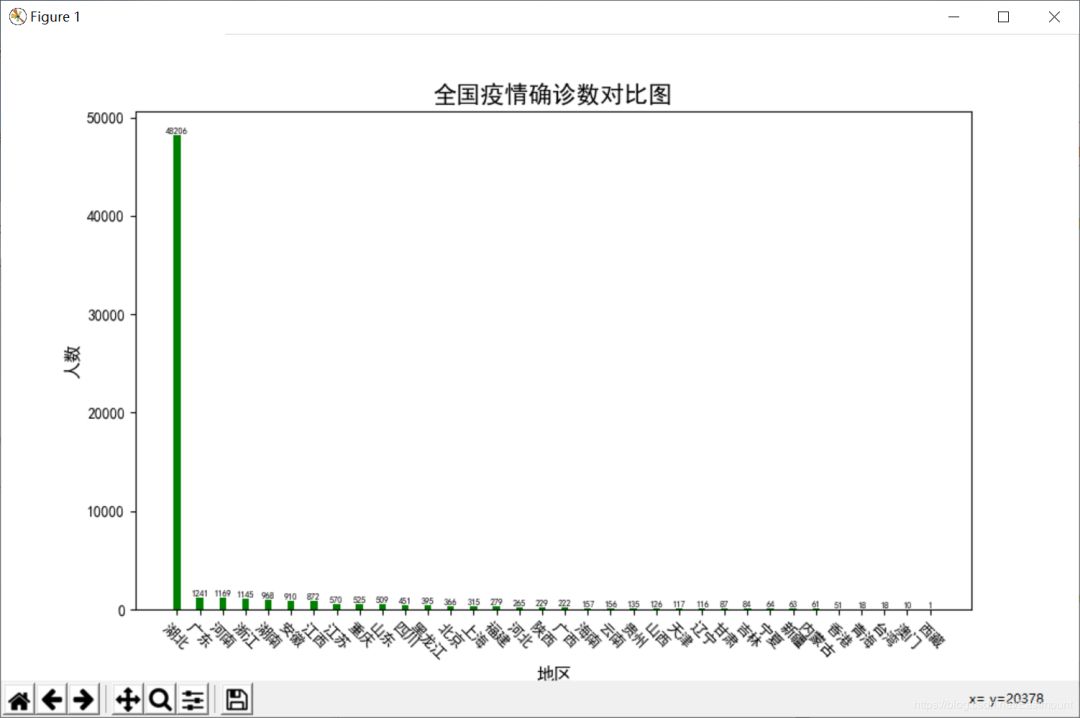 首先,我们调用Matplotlib绘制全国各地区的确诊人数柱状图,帮助大家回忆其基本用法。total_data为字典变量键值对,比如{‘湖北’: 48206, ‘广东’: 1241,…}