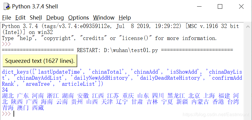 通过分析url地址、请求方法、参数及响应格式,可以获取Json数据,注意url需要增加一个时间戳。下面代码展示了获取数据的键值及34个省份。
