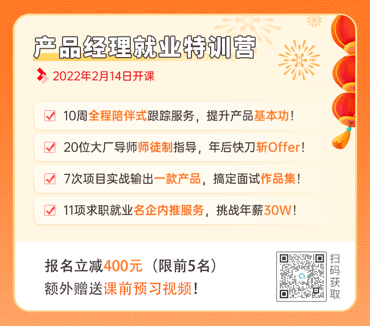 为帮大家金三银四顺利拿Offer,特训营以BAT级大厂能力模型为蓝本,10周带你胜任初级产品岗。目前已有2000+位学员,通过我们的求职辅导名企内推成功就业!