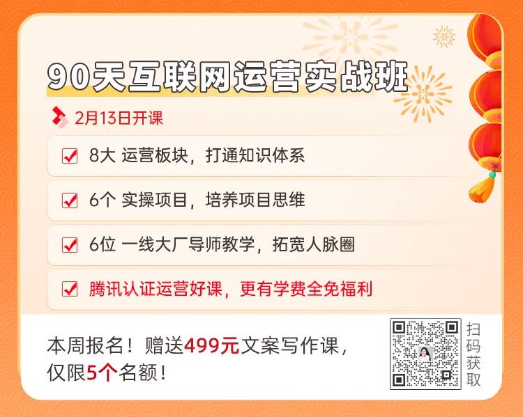 推荐学习《90天互联网运营实战班》课程,学习大厂认可的运营知识,系统提升运营能力,3个月实现升职加薪!