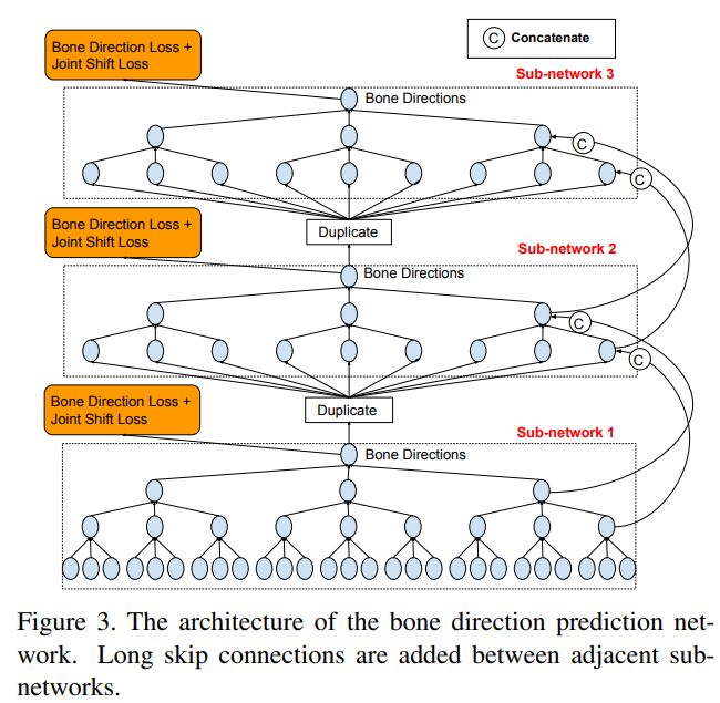 1、本文提出了一种具有长跳跃连接的全卷积传播结构,用于骨骼方向的预测。该网络结构可以实现在分层预测不同骨骼的方向时,而不使用任何耗时的存储单元(例如LSTM)。