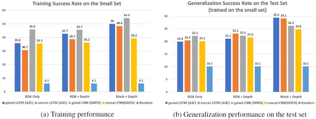 图3:不同模型在具备不同输入信号(RGB Only、RGB+Depth和Mask+Depth)的 Esmall(20 个房屋)上训练时的性能。每一组中,从左到右的条分别对应gated-LSTM、concat-LSTM、gated-CNN、concat-CNN和随机策略。