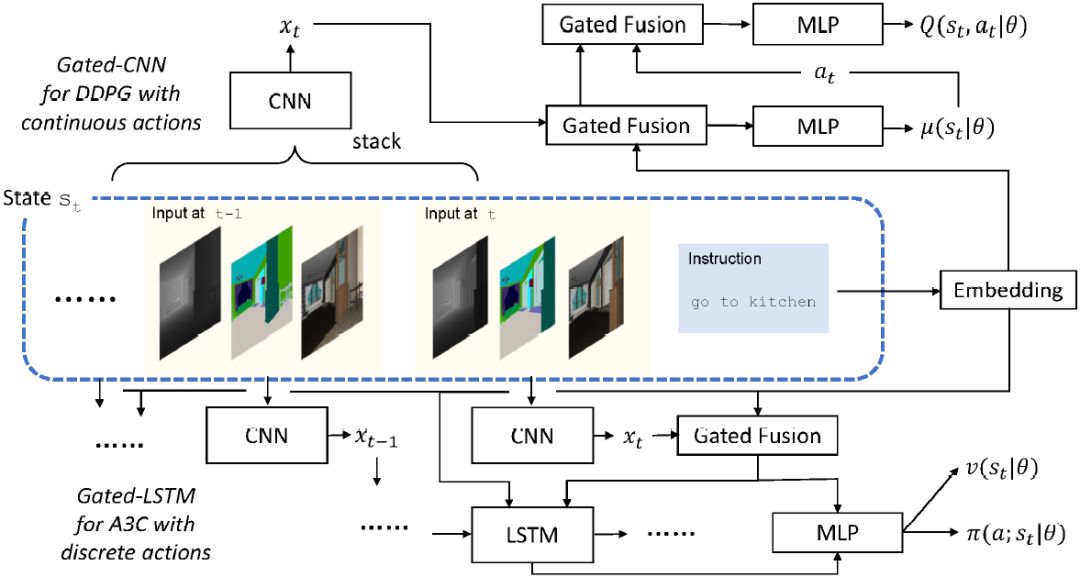 图2:论文提出模型概览。下方代表用于离散动作的gated-LSTM模型,上方代表用于连续动作的gated-CNN模型。Gated Fusion模块指门控注意力(gated-attention)架构。