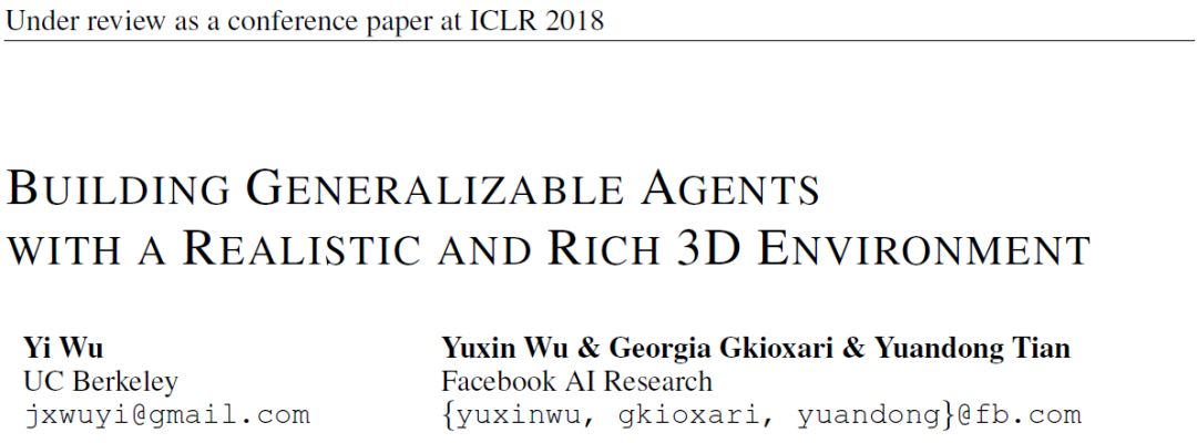 构建虚拟3D环境对于强化学习研究非常重要。近日,UC Bekerley博士生吴翼、FAIR研究工程师吴育昕、博士后Georgia Gkioxari和研究科学家田渊栋共同提交了一篇论文,提出一种基于SUNCG数据集构建的丰富、可扩展的高效环境House3D。研究者用连续和离散动作空间训练强化学习智能体,改善了它们在新环境中的泛化能力。该论文目前已提交至ICLR 2018大会。