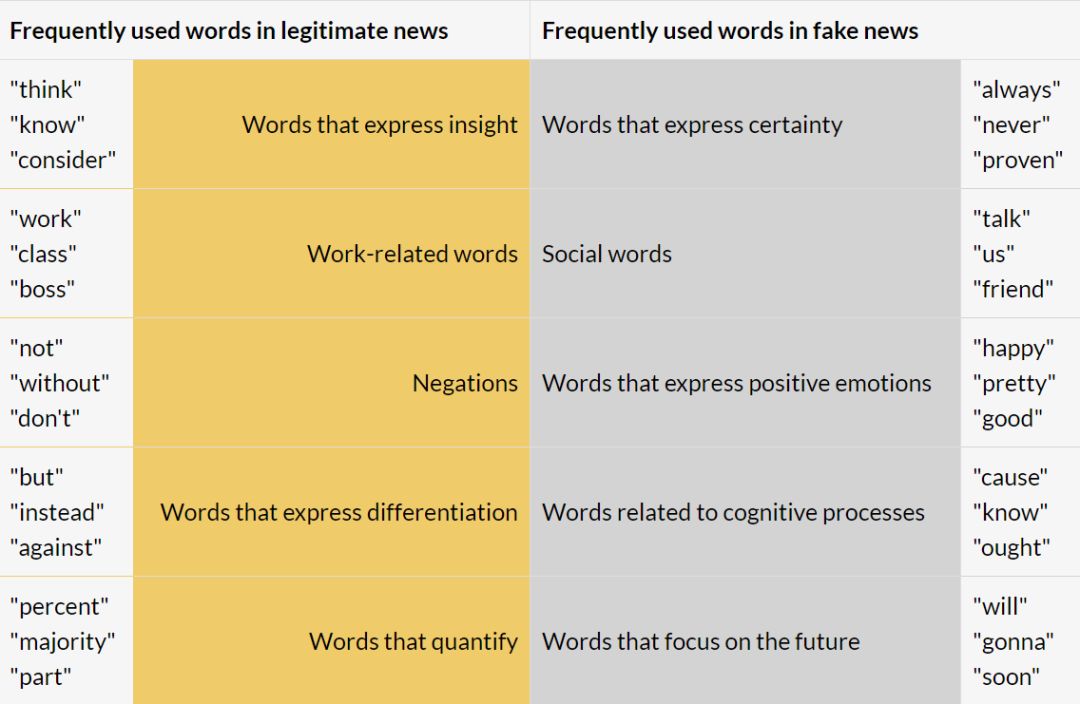 美国伦斯勒理工大学的计算机科学家 Benjamin Horne 和 Sibel Adali 则提出了另一个方法。他们分析了由 Business Insider 评定的最值得信赖媒体发布的 75 篇真实报道,以及网上公认的 75 篇伪新闻,随后总结出:假新闻通常篇幅比真的短,会重复性地出现许多副词,其中的引述和专业词汇也相对更少。