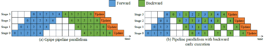 一种 Pipeline 并行方式(Gpipe) 要求反向计算要等所有设备的正向计算完成后才开始,而反向计算可能依赖于正向的输出,导致每个卡正向计算过程中累积的 activation 内存与 micro-batch 数量成正比,从而限制了 micro-batch 的数量。MindSpore 的 Pipeline 并行中,将反向提前,每个 micro-batch 计算完成后,就开始计算反向,有效降低 activation 存储时间,从而提升整体并行效率。