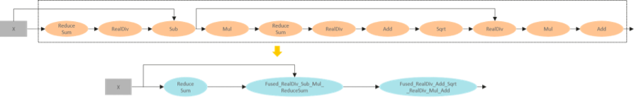 以 LayerNorm 算子为例,通过算子拆分和重组,11 个小算子,组成了 1 个单算子和 2 个融合算子。这些重组后的算子可以生成更加高性能的算子,从而大大降低了整体网络运行时间。