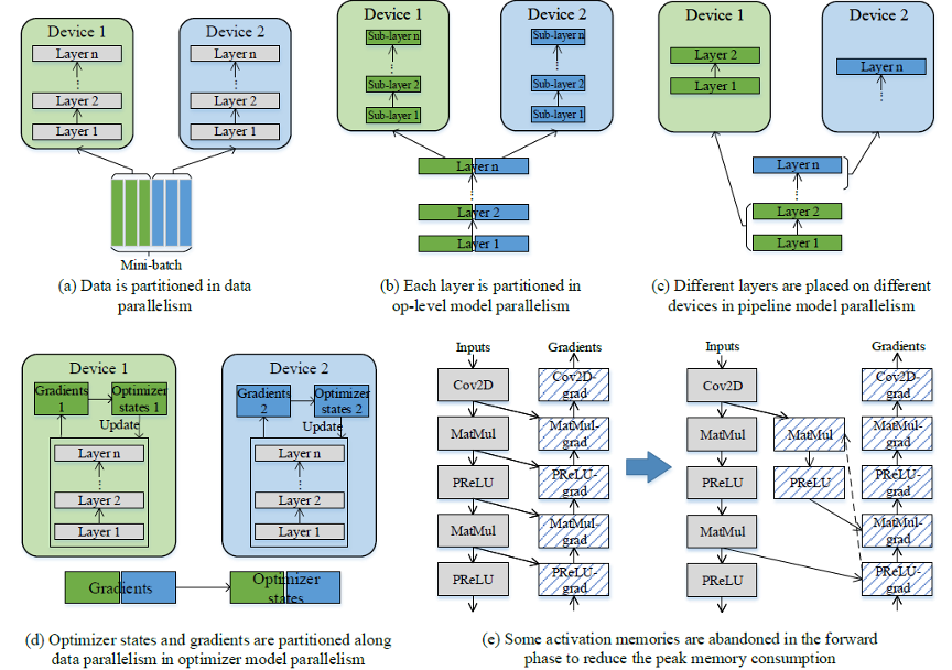 将优化器涉及到的参数和梯度切分到多台设备上。以 Adam 优化器为例,其内部可能有多份与权重同等大小的「动量」需要参与计算。在数据并行的情况下,每个卡都拥有完整的「动量」,它们在每个卡上都重复计算,造成了内存及计算的浪费。通过引入优化器并行,每个卡只保存权重及「动量」的切片,能降低每个卡的静态内存及提升计算效率。