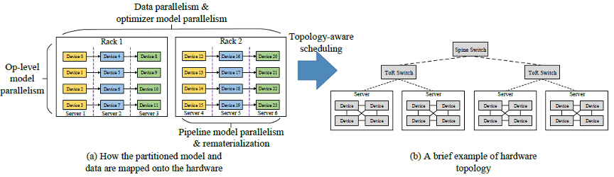 下图 (b) 是一典型的树形的硬件拓扑结构,其带宽随着树深度的增加而降低,并且会产生一些流量冲突。为了利用此特征,MindSpore 的目标是最大化计算通信比,将通信量大的并行方式(算子级并行)放置在服务器内部的多卡之间;将通信量较小(Pipeline 并行)的放置在同一机架内的服务器间;将数据并行(优化器并行)的部分放置在不同机架间,因为该通信可以和计算同时执行(overlap),对带宽要求较低。