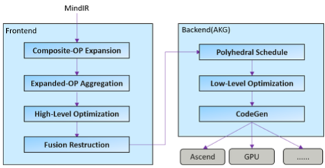 为了提升硬件利用率,MindSpore 使用了图算融合优化技术,通过图层和算子层联合优化,并将「用户使用角度的易用性算子」进行重组融合,然后转换为「硬件执行角度的高性能算子」,从而充分提升硬件资源利用率,进而提升整网执行性能。具体优化流程如下图所示: