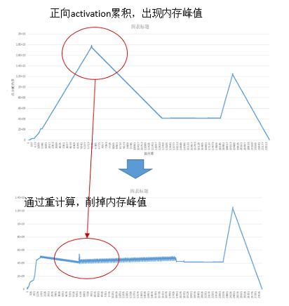 针对正向算子的输出累计保存在内存中,导致内存峰值过大的问题,舍弃了部分正向算子的输出,而是在反向阶段用到时再重新计算一遍。这样做有效地降低了训练过程中的内存使用峰值。如下图所示,第一个内存峰值通过重计算消除,第二个内存峰值可以通过前面讲到的优化器并行消除。