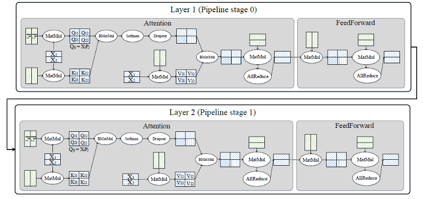 在盘古 2000 亿模型中,MindSpore 将 64 层(layer)划分为 16 个 stage,每个 stage 包含 4 层。在每层中,利用算子级并行的方式对张量进行切分。