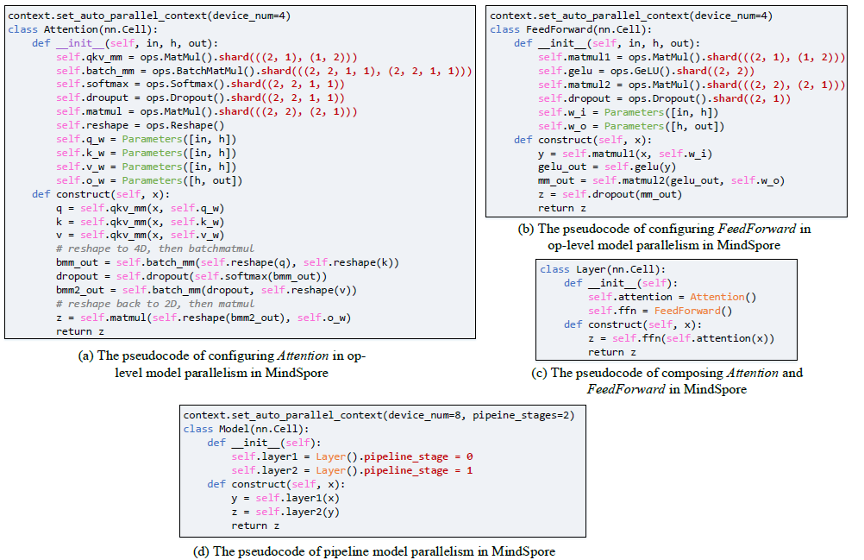 MindSpore 对外屏蔽了复杂并行实现的细节,使得用户像编写单机模型脚本那样简单。用户在单机脚本的基础上,仅通过少了配置就能实现多维度的混合并行。下图是简化版的盘古脚本,其中红色加粗字体表示的在 MindSpore 中的并行策略。将红色加粗字体去掉,则是单机脚本。