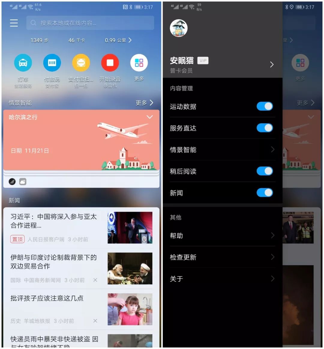 在适当的时间提供适当的传达,是手机负一屏上华为智能助手的使命。基于端侧AI计算和云侧AI数据能力,华为智能助手可以智能推荐新闻信息,以及旅行助手、情景智能卡片提醒等主动服务,信息流+服务流的融合,方便用户在这一个页面进行更有效率的交互。