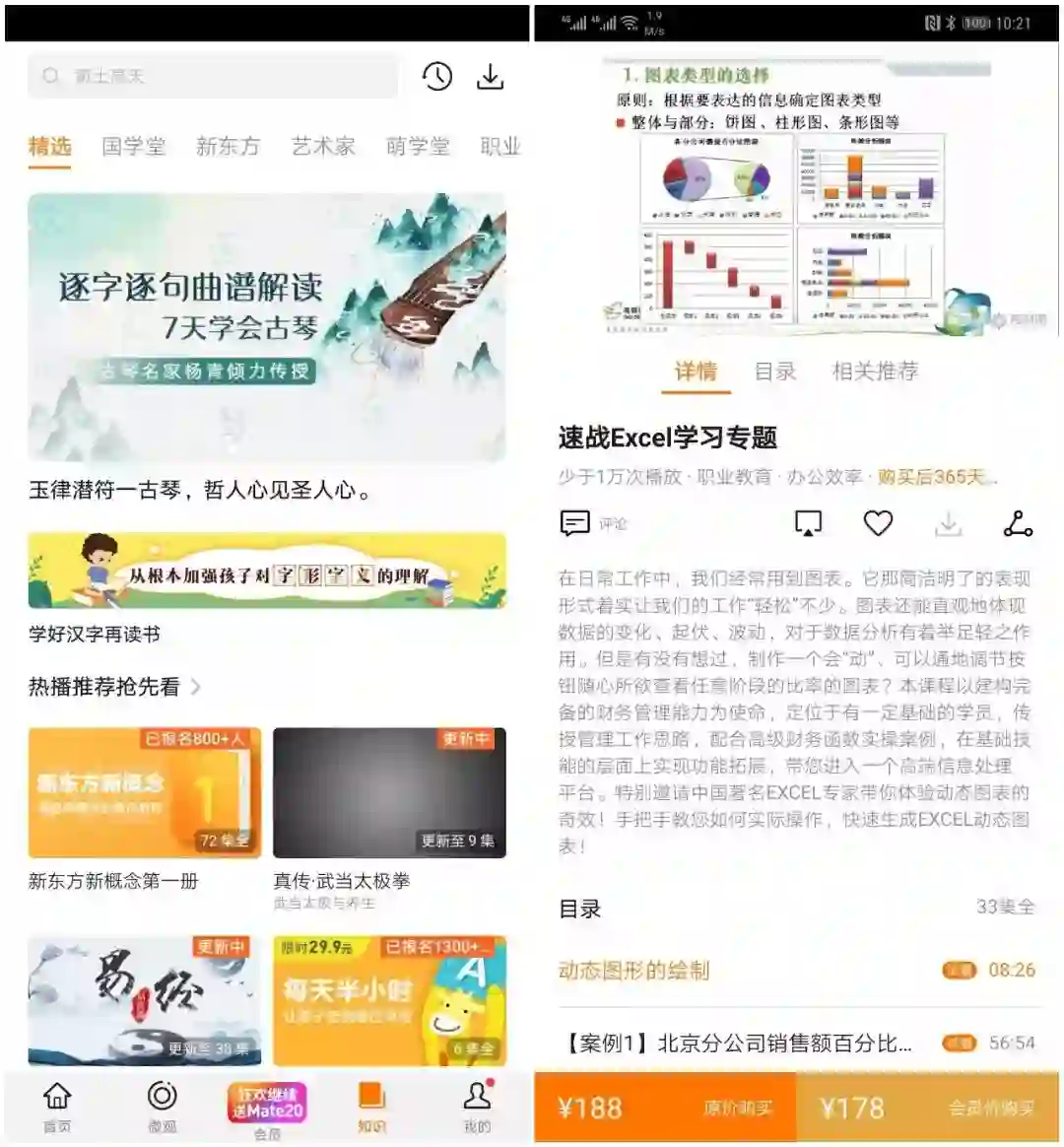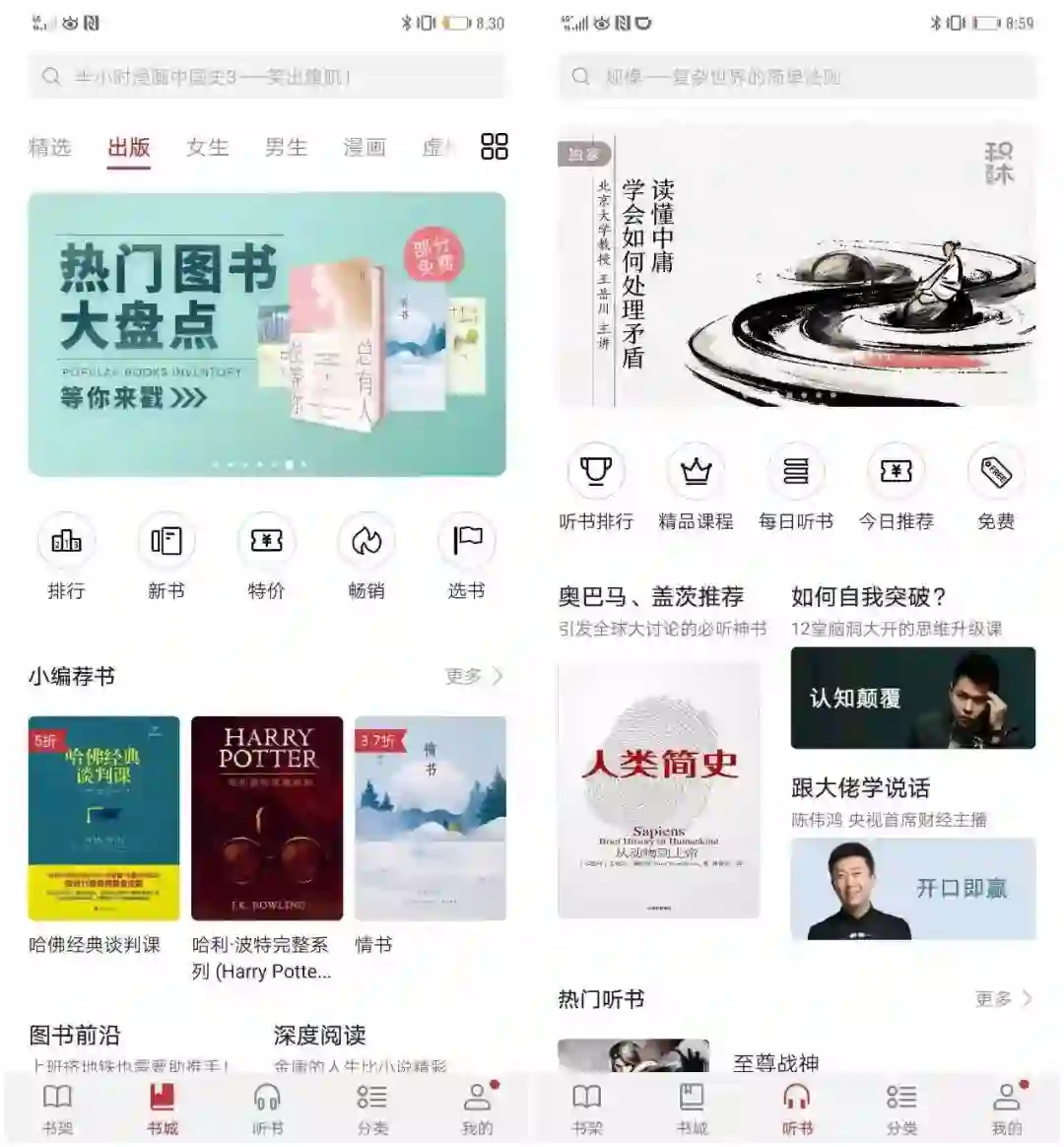 阅读方面,除了常见的图书分类,还有听书频道,精品课程、有声小说,提升碎片化阅读的体验。