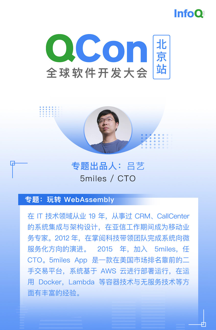 为了给大家提供更多思考,今年 9 月,QCon 全球软件开发大会(北京站),我们设置了「玩转 WebAssembly」专题,邀请了美国本土知名电商平台 5miles 的 CTO 吕艺担任出品人,我们将从前后端等多重视角探讨 Wasm 的落地进展,帮你用上和用好 Wasm。
