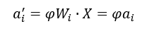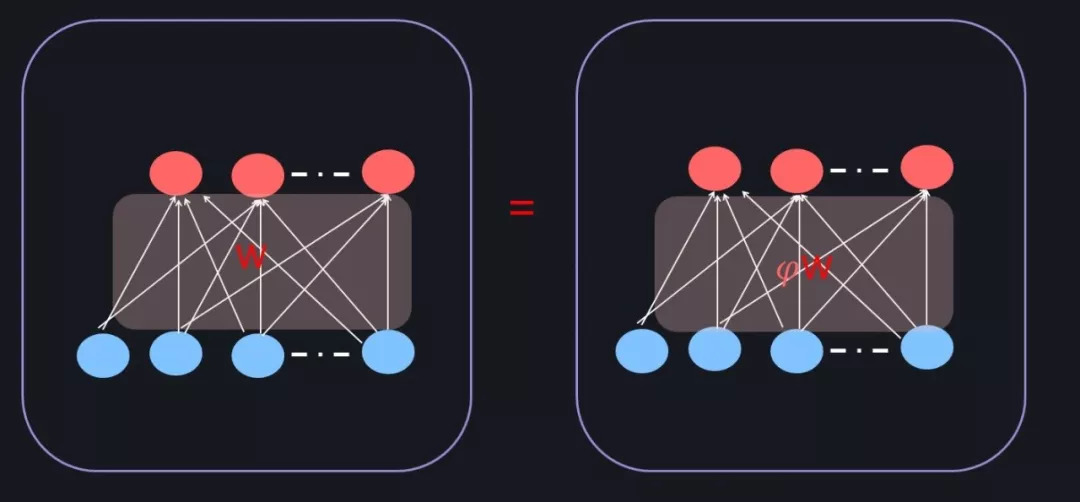 现在假设我们开始 re-scale 边权重向量 W_i,使得这些边的权重缩放因子为φ,其对应的新的激活得到相同的缩放比例: