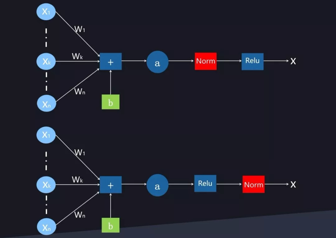 那么对于第一类的 Normalization 操作,其在什么位置发挥作用呢?目前有两种在神经元中插入 Normalization 操作的地方(参考图 4),第一种是原始 BN 论文提出的,放在激活函数之前;另外一种是后续研究提出的,放在激活函数之后,不少研究表明将 BN 放在激活函数之后效果更好。本文在讲解时仍然遵循 BN 原始论文,后续讲解都可以看成是将 Normalization 操作放在激活函数之前进行。