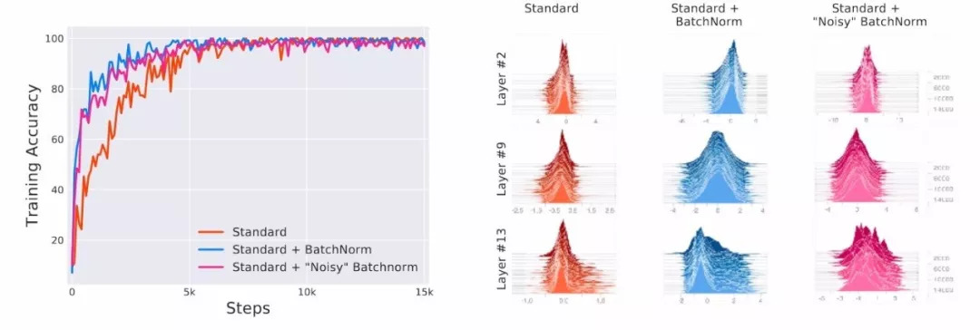 但是能够解决 ICS 问题其实并不是 BN 为何有效背后真正的原因,最近有一些研究对此作了探讨。那么 ICS 问题真实存在吗?ICS 问题在较深的网络中确实是普遍存在的,但是这并非导致深层网络难以训练的根本原因。另外,BN 解决了 ICS 问题了吗?其实也没有。实验一方面证明:即使是应用了 BN,网络隐层中的输出仍然存在严重的 ICS 问题;另一方面也证明了:在 BN 层输出后人工加入噪音模拟 ICS 现象,并不妨碍 BN 的优秀表现(参考图 19)。这两方面的证据互相佐证来看的话,其实侧面说明了 BN 和 ICS 问题并没什么关系。
