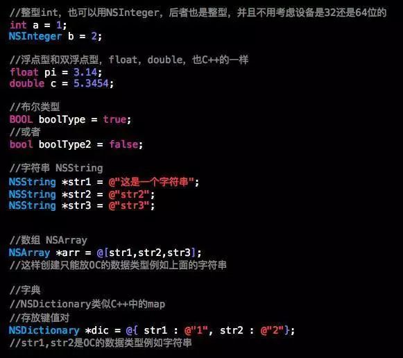 接下来我们来看一下基本的数据类型,我就说一些比较常用的吧,C++的我就不说了。 OC中的数据类型