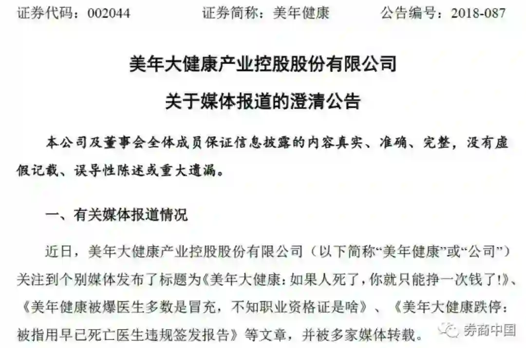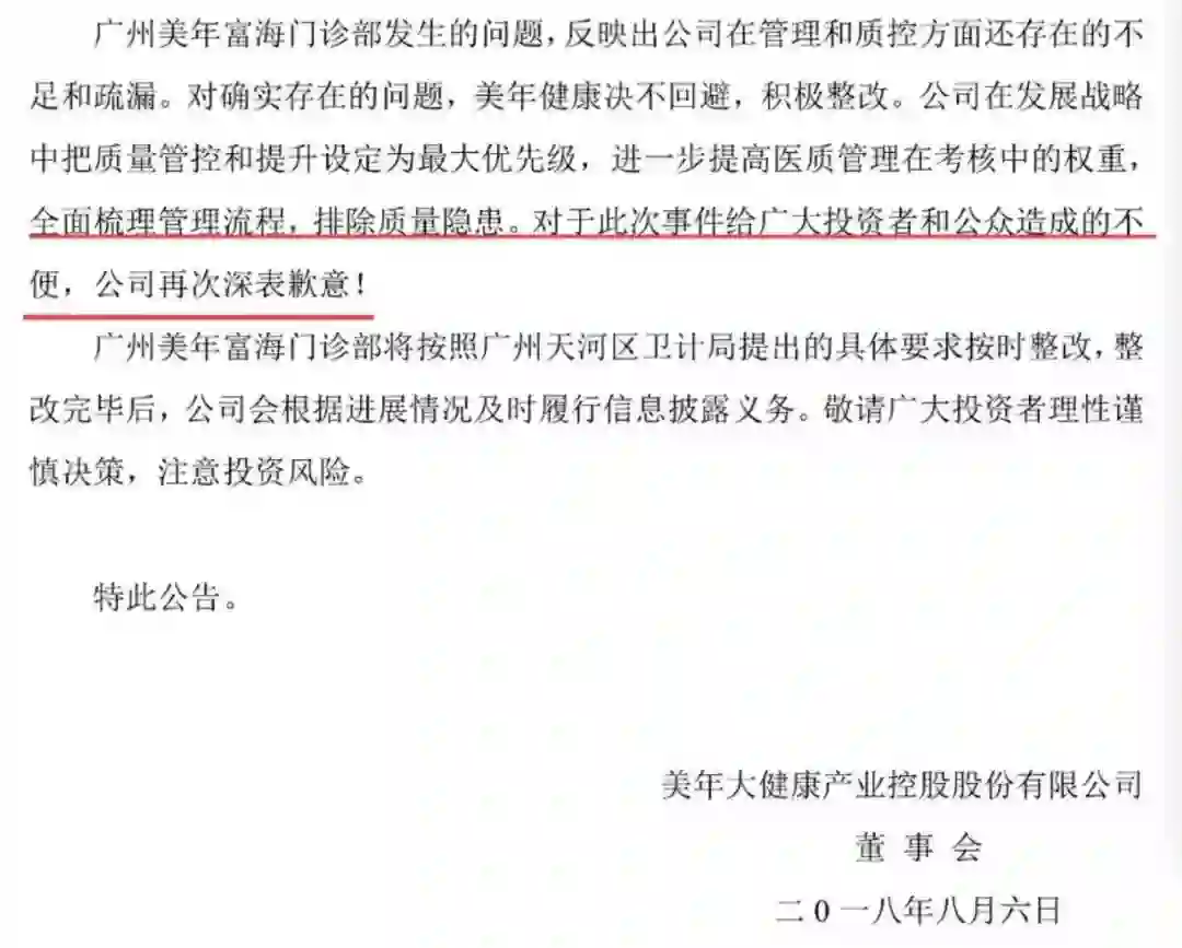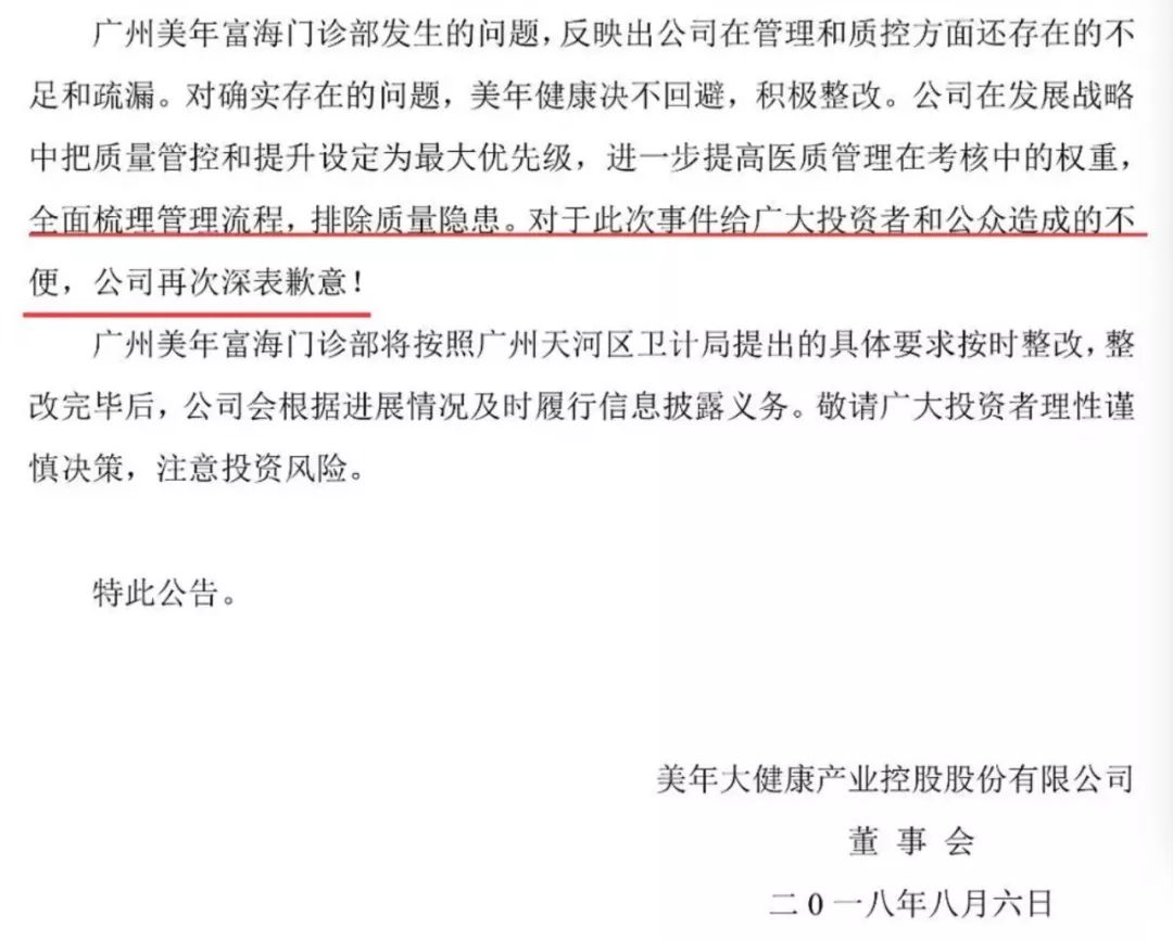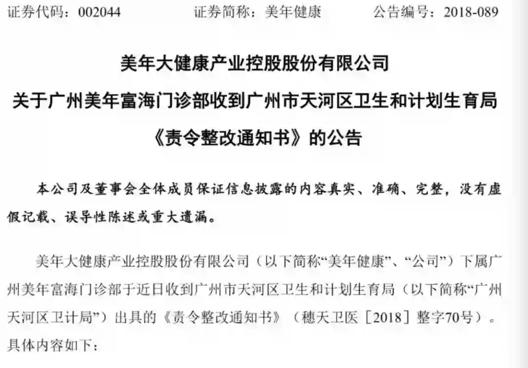 而就在昨晚(8月5日),美年健康发布公告,称收到天河区卫计局《责令整改通知书》,且在公告中表示歉意。