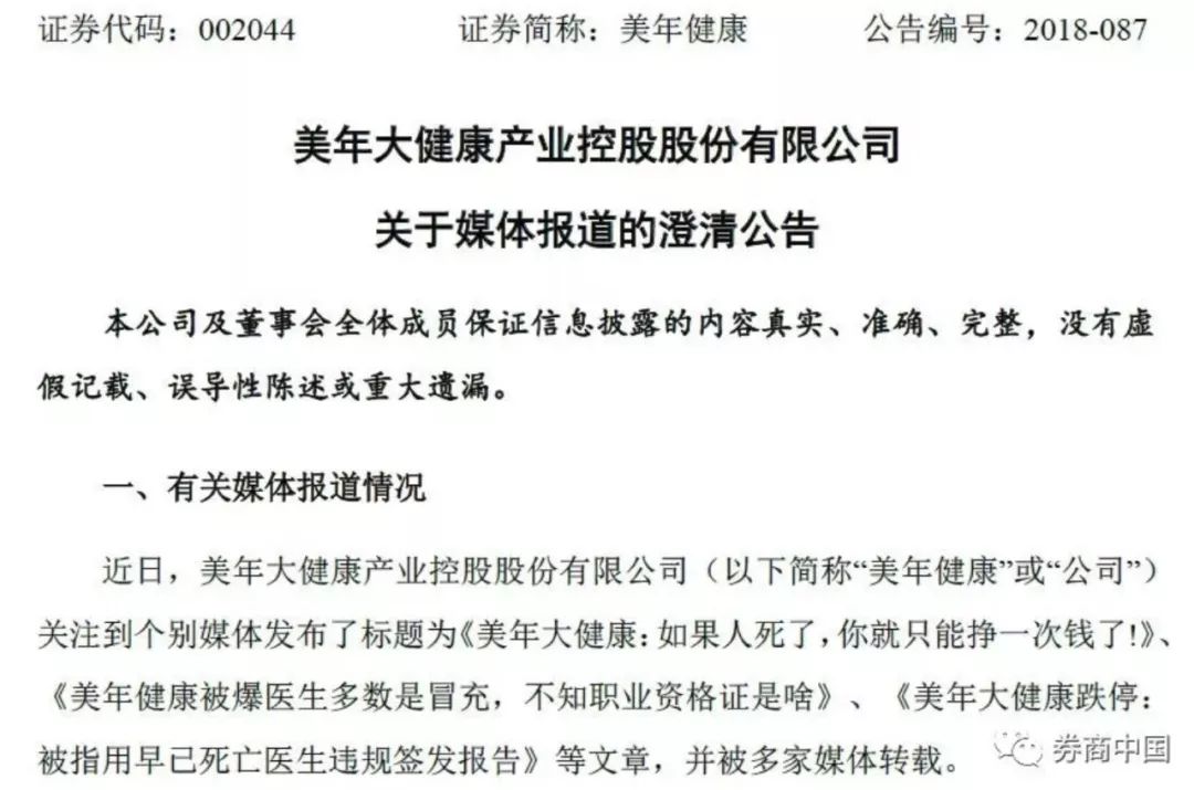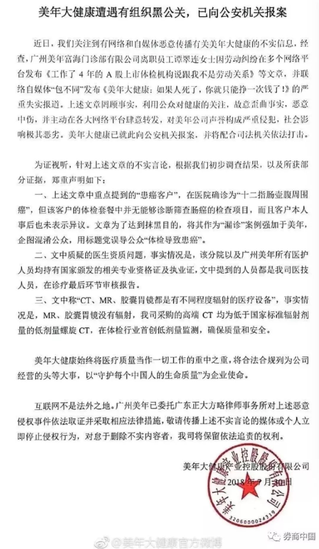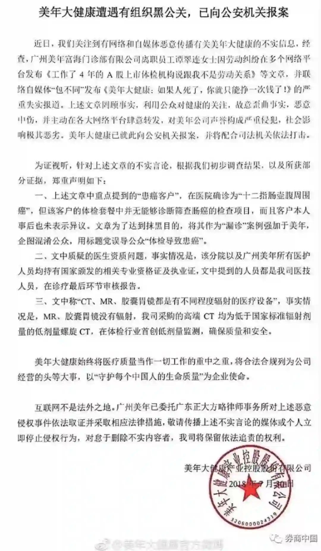 相信大家还记得,7月30日,也就是“假医生”事件首次发酵当天,美年大健康声明称,近日,我们关注到有网络和自媒体恶意传播有关美年大健康的不实信息,美年大健康已就此向公安机关报案,并将配合司法机关依法打击。