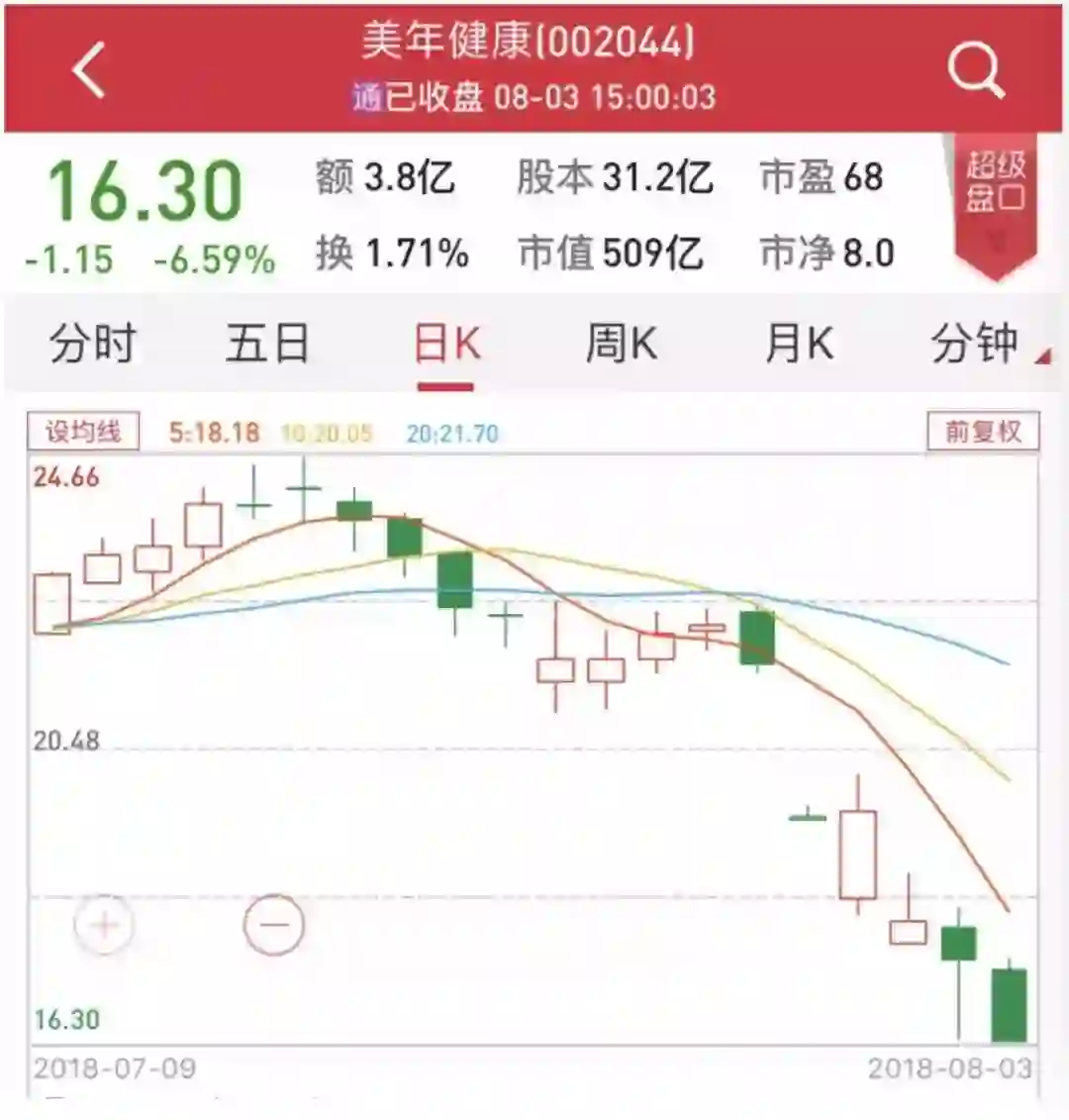 7月30日,受“假医生”负面事件影响,美年健康股价出现跌停,7月31日,小幅上涨0.31%,此后又持续大跌。