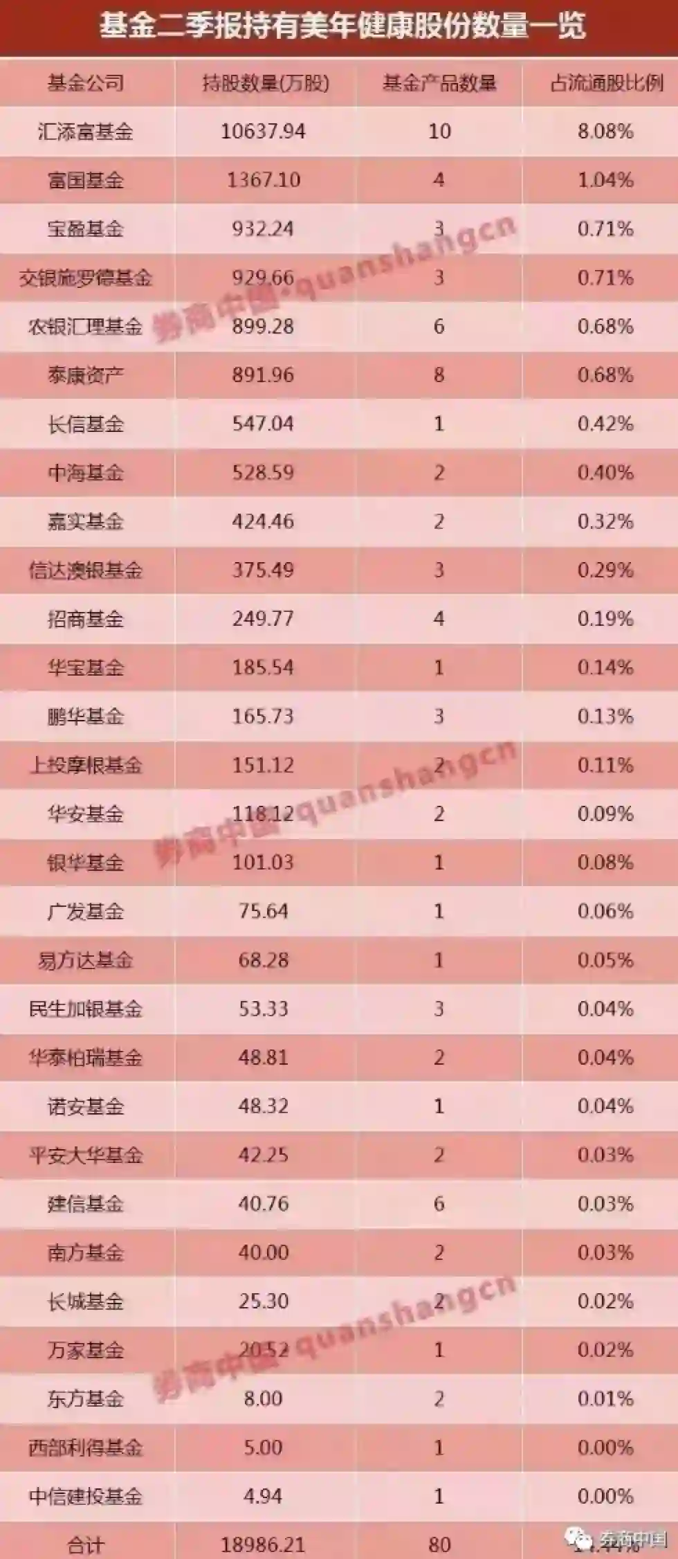 据券商中国梳理,作为专注于体检的上市公司在A股的标的并不多,美年健康获得了众多机构资金的青睐。以基金二季报数据来看,共有29家基金公司80只产品踩雷,合计持股1.9亿股,占流通股比例14.44%。