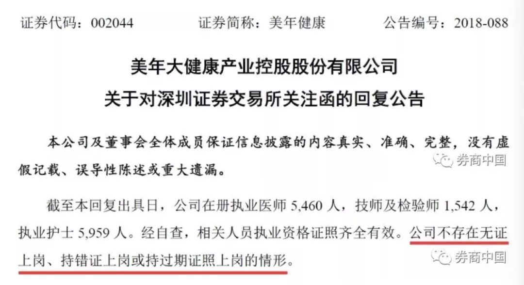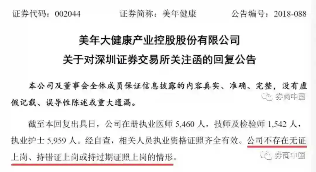 5天前,美年健康回复深交所称,公司不存在无证上岗、持错证上岗或持过期证照上岗的情形。
