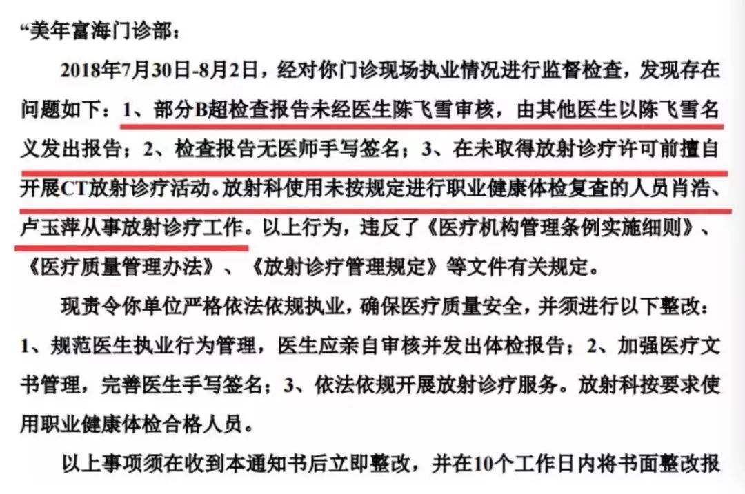 8月5日晚,美年健康发布公告,广州美年富海门诊部收到广州市天河区卫生和计划生育局《责令整改通知书》,证实了美年健康美年富海门诊部存在冒名医生、体检报告无医师手写签名、违规开展CT放射诊疗活动等三大违规行为: