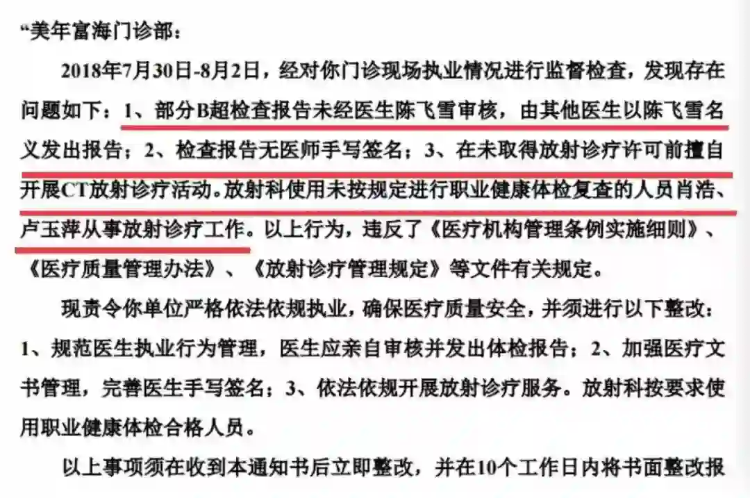 美年健康在8月5日晚的公告中表示,在收到《责令整改通知书》后,第一时间派驻专项工作小组进驻广州美年富海门诊部,进行深度调查,并逐步落实整改。公告称: