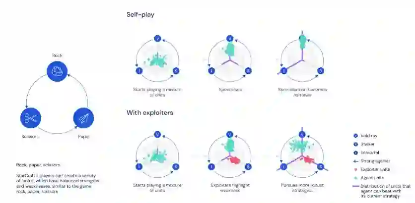光赢得胜利是不够的,需要训练能与所有玩家抗衡的“主要智能体”,也需要专注于训练能够揭示敌方重大缺陷的智能体。