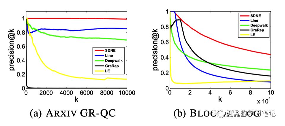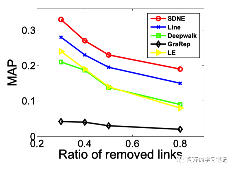 我们来看一下 SDNE 在不同数据集下,采用不同评价指标(MAP、Precision)的性能表现: